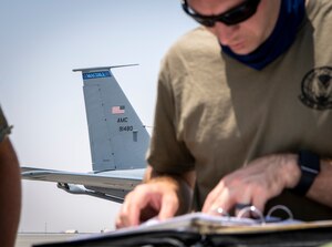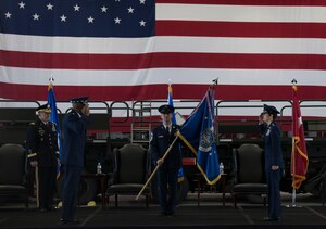 Col. Benjamin Jonsson, 6th Air Refueling Wing commander, pauses for a photo with Lt. Col. Shannon McDougald, the assuming 6th Comptroller Squadron commander, during an assumption of command ceremony at MacDill Air Force Base, Fla., Aug. 7, 2020. In compliance with COVID-19 guidelines, the