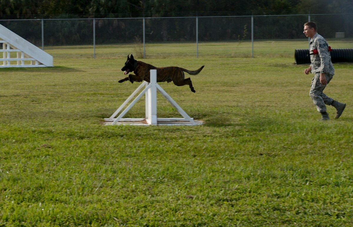 Col. April Vogel, coomander of the 6th Air Mobility Wing (AMW), Col. Jennifer Crossman, vice commander of the 6th AMW, and Chief Master Sgt. Melanie Noel, command chief of the 6th AMW, visited the 6th Security Forces Squadron miitary working dog section during an immersion, Nov. 7, 2017 at MacDill Air Force Base, Fla. While visiting the MWD section, base leadership was briefed on daily tasks, given a tour of the facility and acted as a decoy in a MWD demonstration. (U.S. Air Force photo by Senior Airman Jenay Randolph)