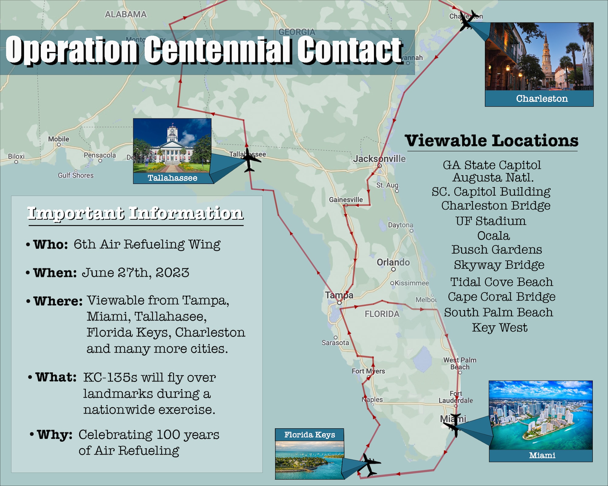 The flyover will begin with the KC-135 Stratotanker from MacDill Air Force Base, Florida, and C-17 Globemaster III from Charleston Air Force Base, South Carolina. The route of flight will be visible from landmarks in Florida, Georgia, and South Carolina. Landmarks and approximate local times are as follows: