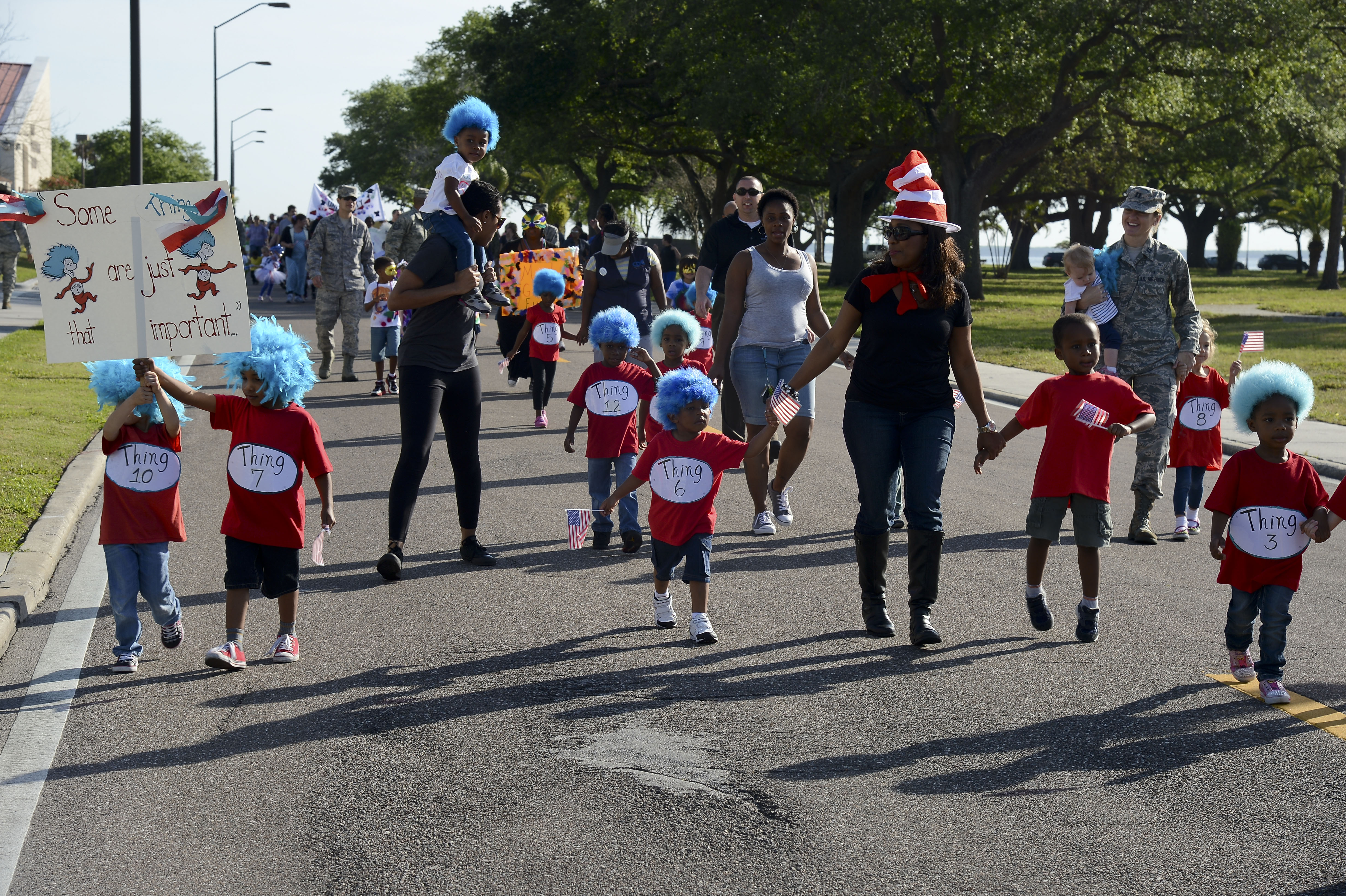 Children, parents and staff from the Child Development Centers walk in the Month of the Military Child parade April 3, 2014 at MacDill Air Force Base, Fla. Throughout the month of April, the centers will be hosting a calendar of events, to include an ice cream social, flight art auction, sidewalk chalk art walk, along with various spirit and themed days. (U.S. Air Force photo by Senior Airman Jenay Randolph/Released)