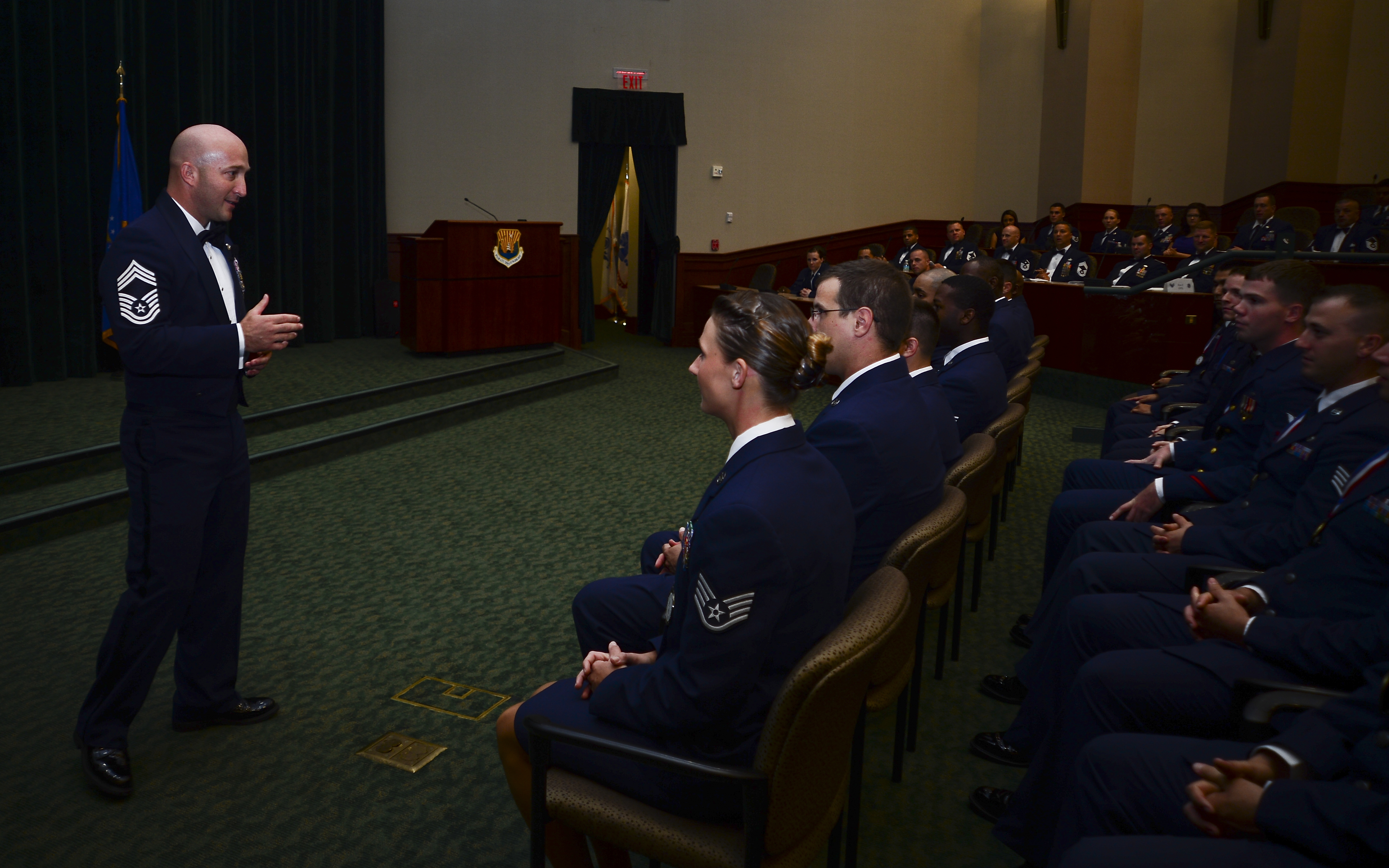 Chief Master Sgt. Anthony Cruz Munoz, 6th Contracting Squadron superintendent, provides mentorship with Airman Leadership School class 13-E at MacDill Air Force Base, Fla., June 27, 2013. Twenty three Airmen and one coastguardsman from ALS class 13E completed the five week course. (U.S. Air Force photo by Senior Airman Melissa Paradise/Released/cropped for point of interest)