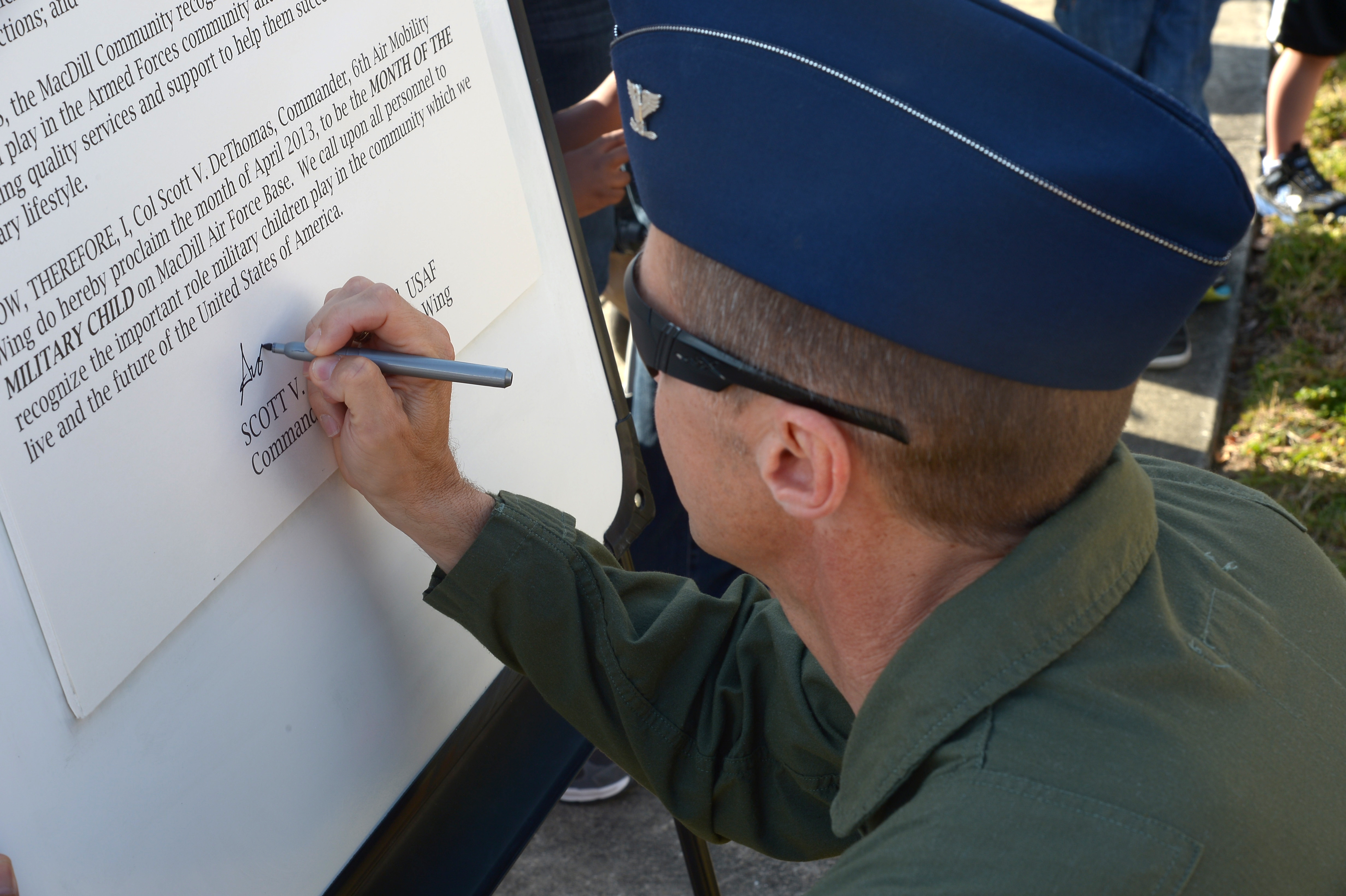 Col. Scott DeTomas, 6th Air Mobility Wing commander, signs the Month of the Military Child Proclamation at MacDill Air Force Base Fla., April 19, 2013. The proclamation states the month of April is the Month of the Military Child at MacDill AFB. (U.S. Air Force Photo by Airman 1st Class Tori Schultz/Released)