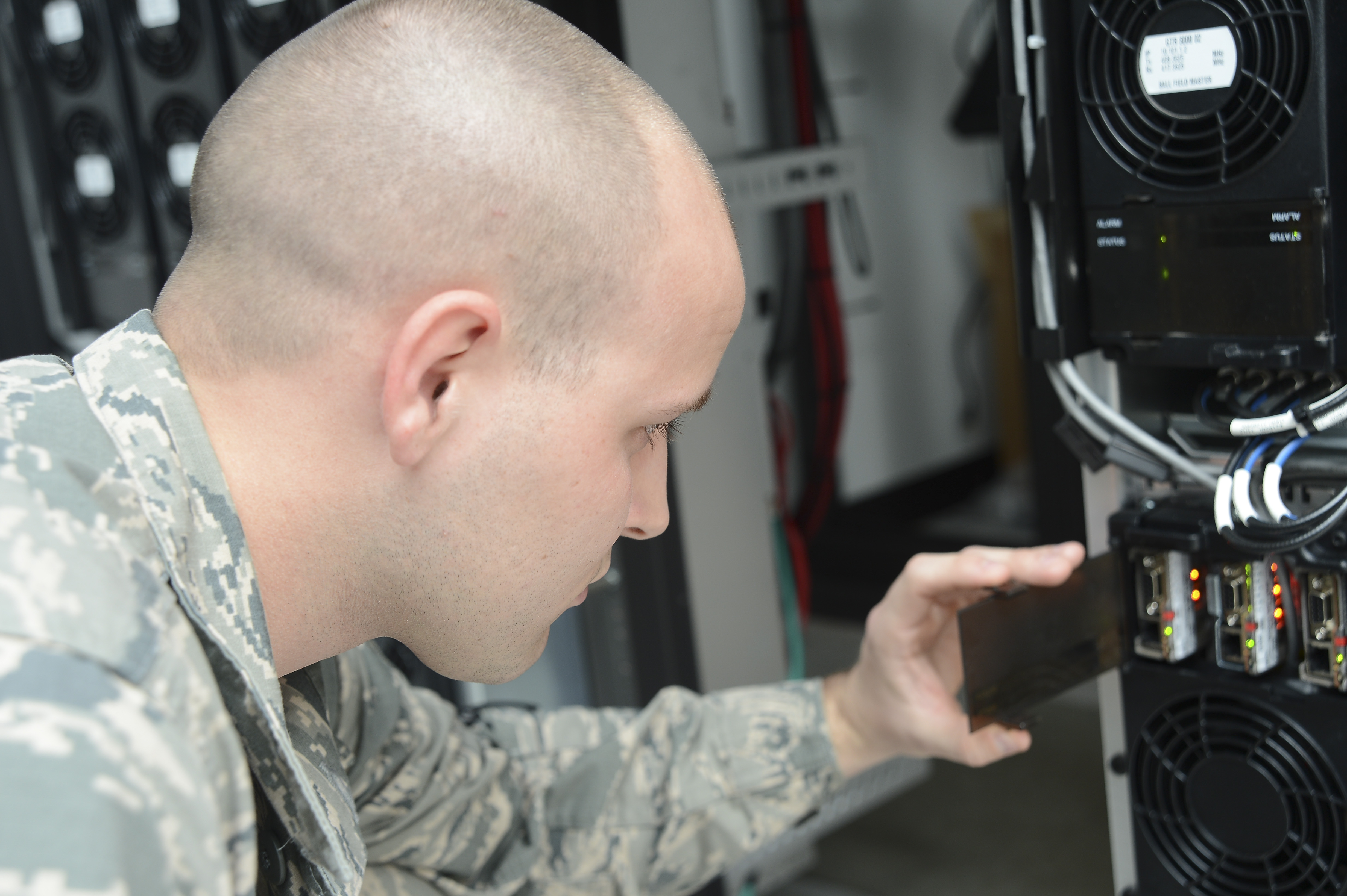 Senior Airman Jared Arledge, 6th Communications Squadron radio frequency transmissions journeyman, opens a back compartment of the tower on the trunking system at MacDill Air Force Base Fla., Feb. 25, 2013. The Trunked Radio System is a computer-controlled two-way radio system that allows sharing of radio frequency channels among a large group of users. (U.S. Air Force photo by Airman 1st Class Vernon Fowler/Released)