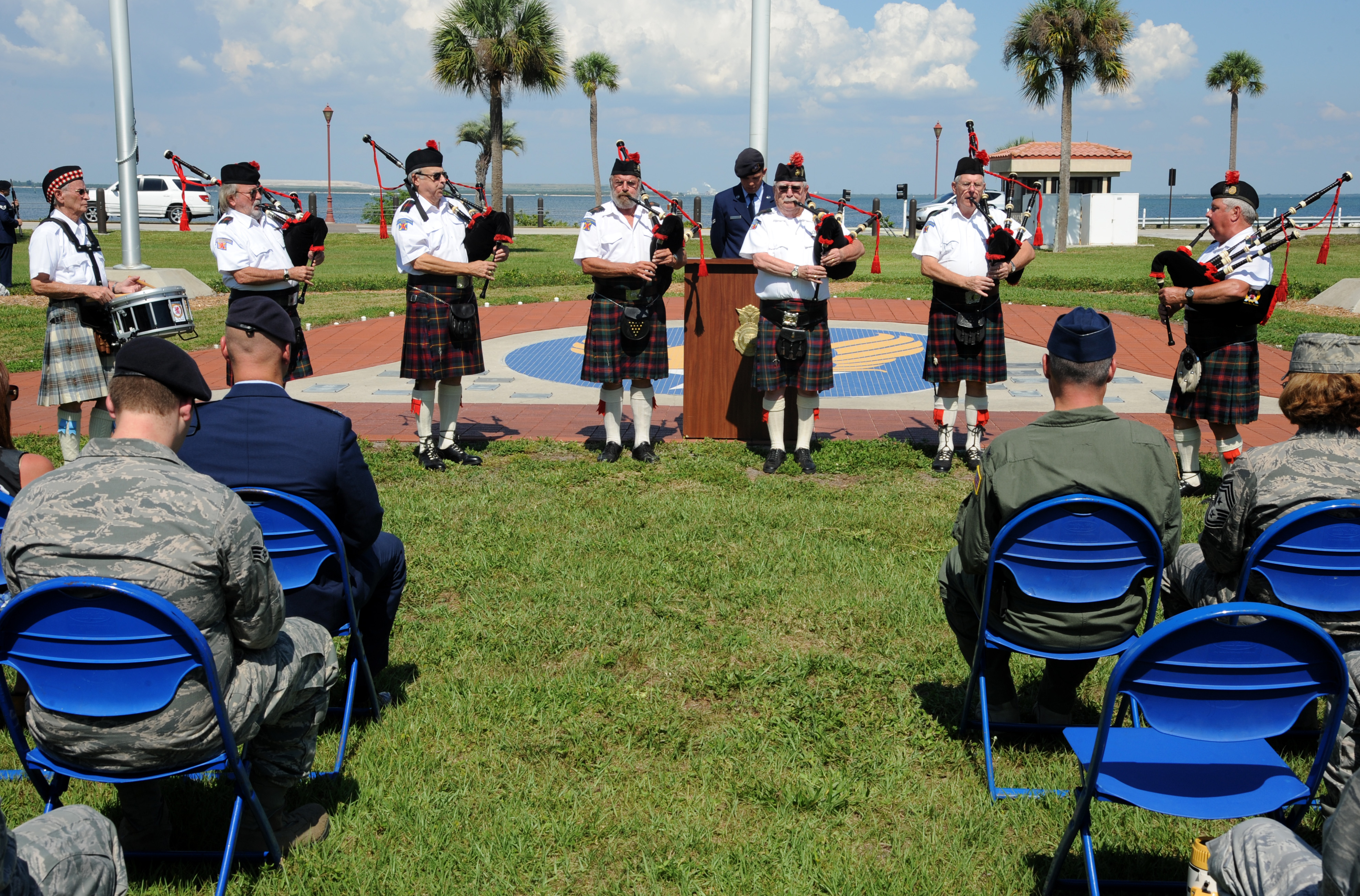Members of the St. Andrews Pipe Band perform a song during a retreat ceremony honoring fallen law enforcement officers at MacDill Air Force Base, Fla., May 18, 2012. The ceremony was held as part of National Police Week. (U.S. Air Force photo by Airman Basic David Tracy)