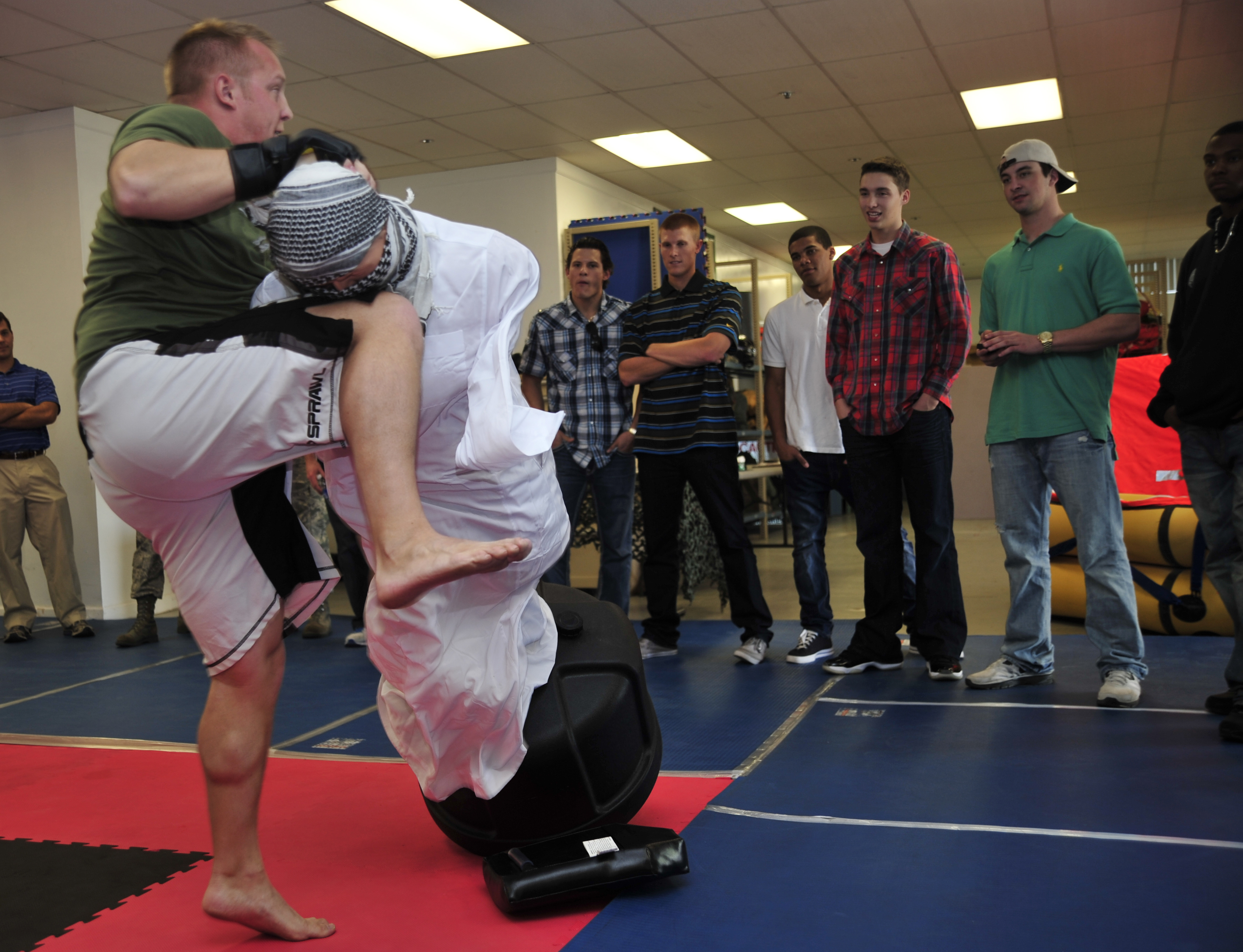 U.S. Air Force Staff Sgt. Chris Ceaser, 6th Operations Support Squadron Survival Evasion Resistance and Escape specialist, performs different offensive fighting techniques to the minor league players of the Tampa Bay Rays baseball team at MacDill Air Force Base, Fla., Jan. 10, 2012. The minor league players of the Tampa Bay Rays came to visit the base and were invited to participate in a demonstration of a Survival Evasion Resistance and Escape class. (U.S. Air Force photo by Airman 1st Class Shandresha Mitchell\Released)