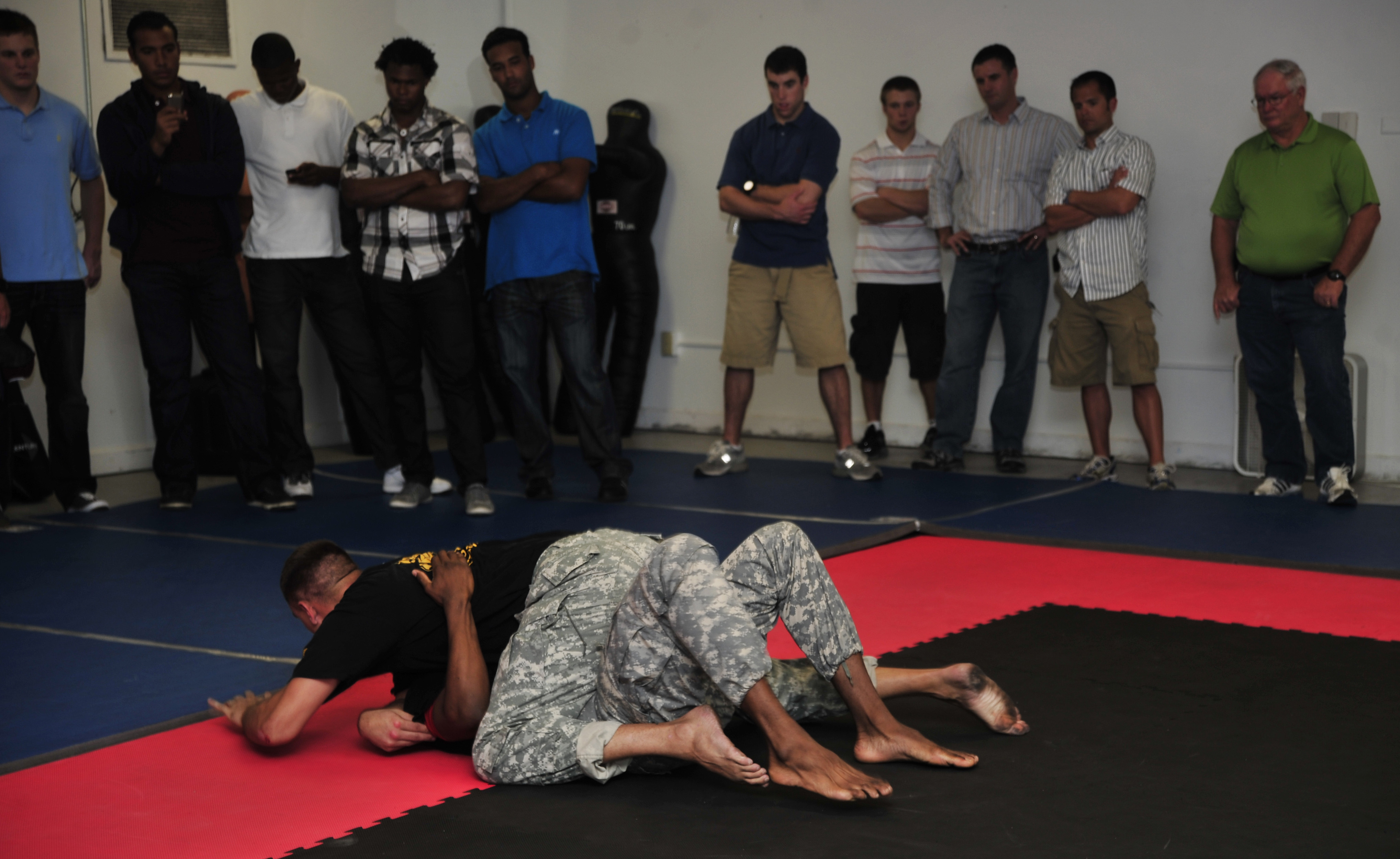 (Top) U.S. Army Staff Sgt. Stewart Tignor, Joint Communications Support Element combative instructor, and U.S. Army Staff Sgt. Matthew Boyd, JCSE combative instructor assistant, demonstrate different techniques to escape mounting positions during combat to minor league players of the Tampa Bay Rays baseball team at MacDill Air Force Base, Fla., Jan. 10, 2012. The Rays players came to visit the base and were allowed to participate in a demonstration of a Survival Evasion Resistance and Escape class. (U.S. Air Force photo by Airman 1st Class Shandresha Mitchell/released)