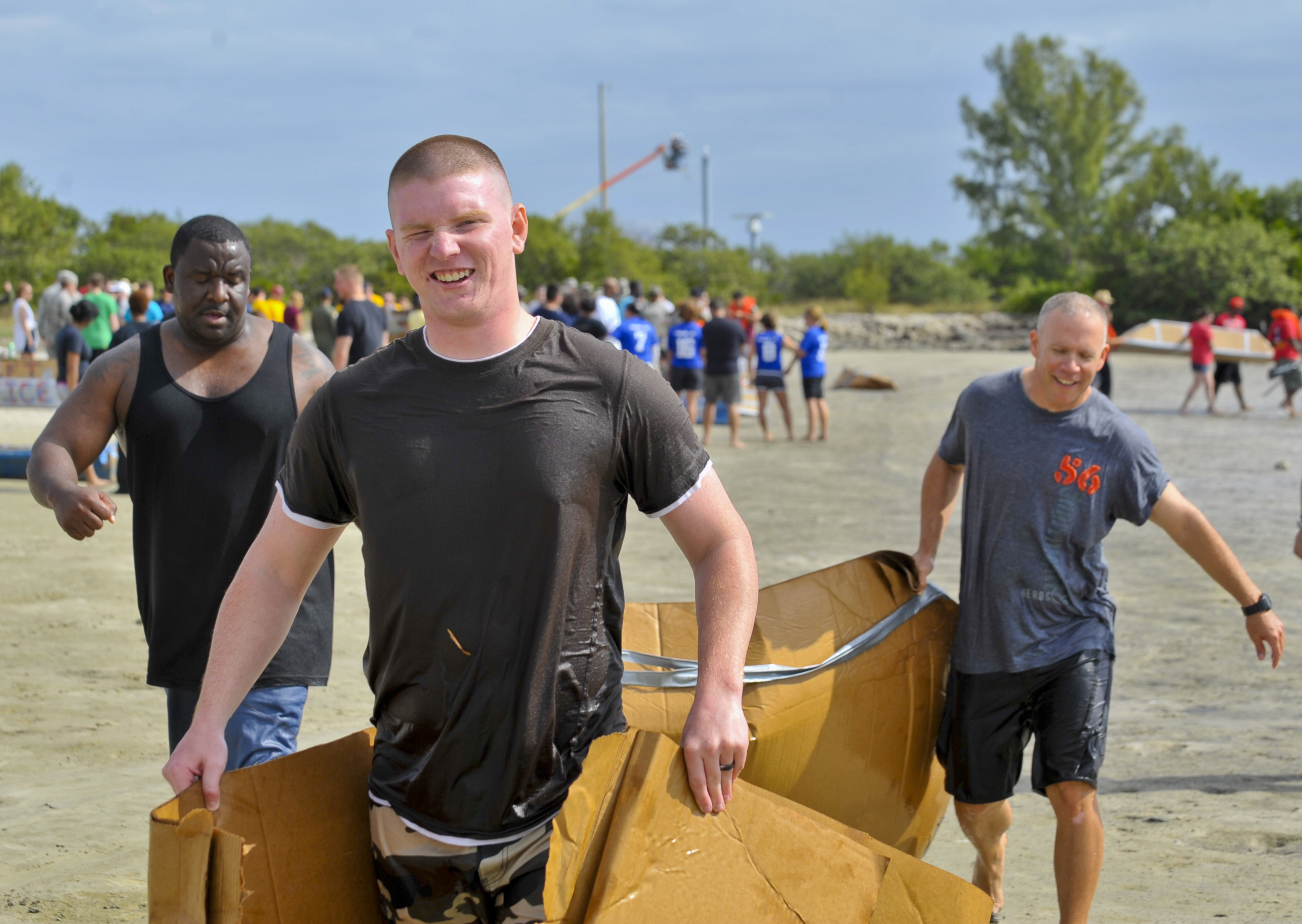 Airman 1st Class Garrick Williams, 6th Contracting Squadron, carries the remains of the 6th CS’s cardboard boat after its race in the annual Boat Regatta at MacDill Air Force Base, Fla., on Nov. 18, 2011. The Boat Regatta was hosted by MacDill’s Outdoor Recreation center and promoted team building for everyone who participated. (U.S. Air Force photo by Airman 1st Class Shandresha Mitchell/Released)