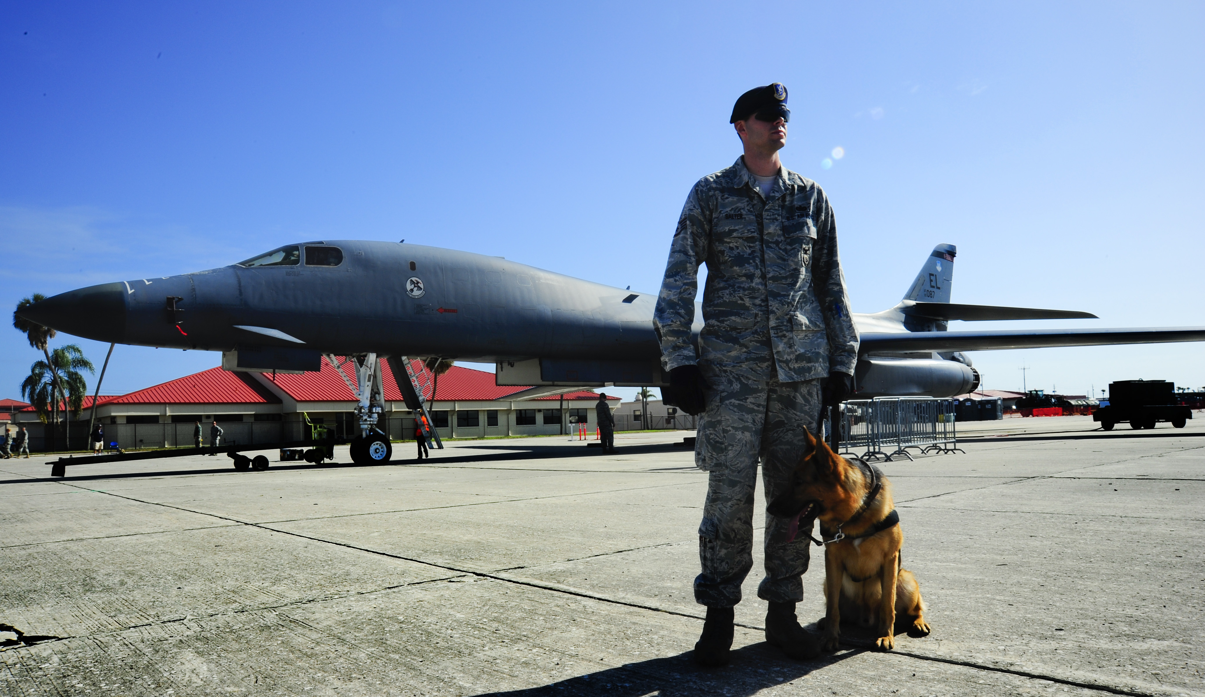 Staff Sgt. Matthew Salter, 436th Security Forces Squadron military working dog handler, and his K-9 Rico, secure the perimeter surrounding the B-1B Lancer on the Flightline at MacDill Air Force Base Fla., during MacDill’s 2011 AirFest Nov 6, 2011. AirFest was host to spectacular aerial demonstrations, static displays and featured the Air Force Thunderbirds, giving the Tampa Bay community the opportunity to witness firsthand the capabilities of the armed forces.( U.S. Air Force photo by Staff Sgt. Angela Ruiz)