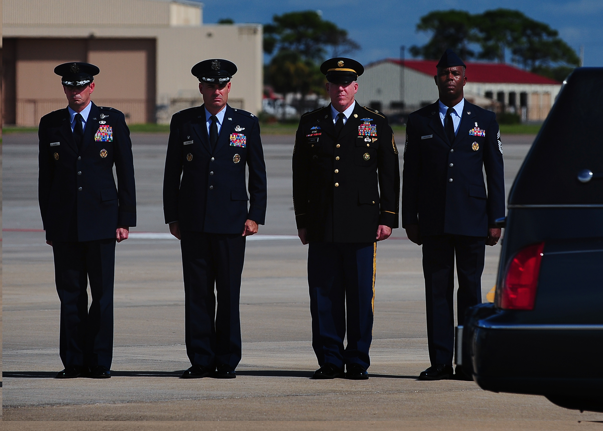 Brig. Gen. Michael Plehen, Special Plans Working Group deputy director at United States Central Command, Col. Lenny Richoux, 6th Air Mobility Wing commander, Command Sgt. Major Frank Grippe, Command Senior Enlisted Leader for the United States Central Command and Chief Master Sgt. Lewis Singleton, 6th Medical Group command chief salute the precession as it leaves the flightline on MacDill Air Force Base, Fla., Sept. 20, 2011. Marquis is attached to 1st Battalion, 5th Infantry Regiment, 1st Stryker Brigade Combat Team, 25th Infantry Division, Fort Wainwright, AK. He passed away Sept. 4, 2011 from injuries sustained after insurgents attacked his unit. (U.S. Air Force photo by Airman 1st Class Melanie Bulow-Gonterman)