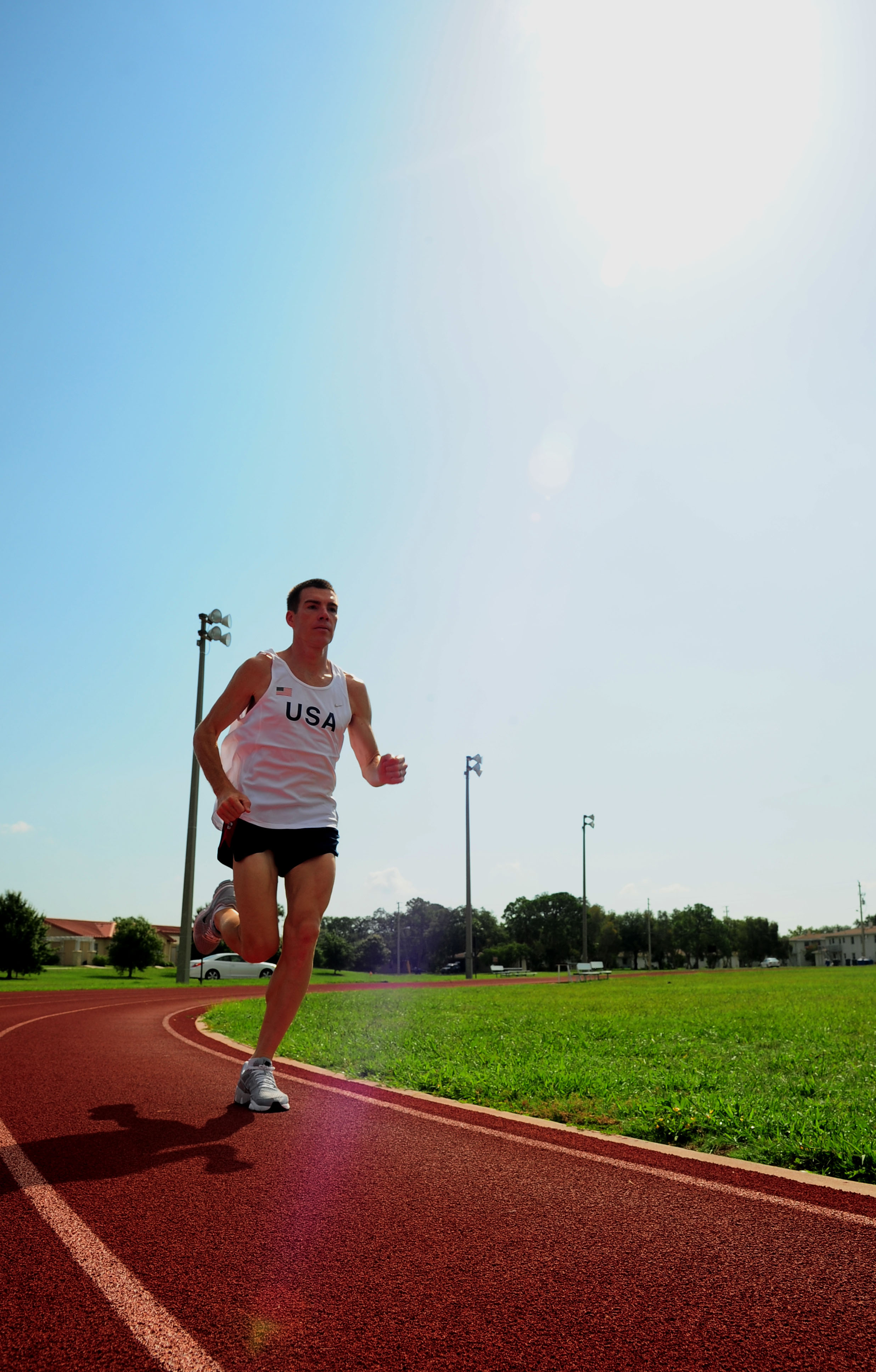 U.S. Army Maj. Dan Browne, Chula Vista, Calif., rounds a corner during a workout at the Short Fitness Center on MacDill Air Force Base, Fla., July 12, 2011. Browne runs the 10000 meter race for the Armed Forces Track Team staging out of MacDill on their way to the Armed Forces Championships in Brazil. (U.S. Air Force photo by Airman Basic David Tracy)