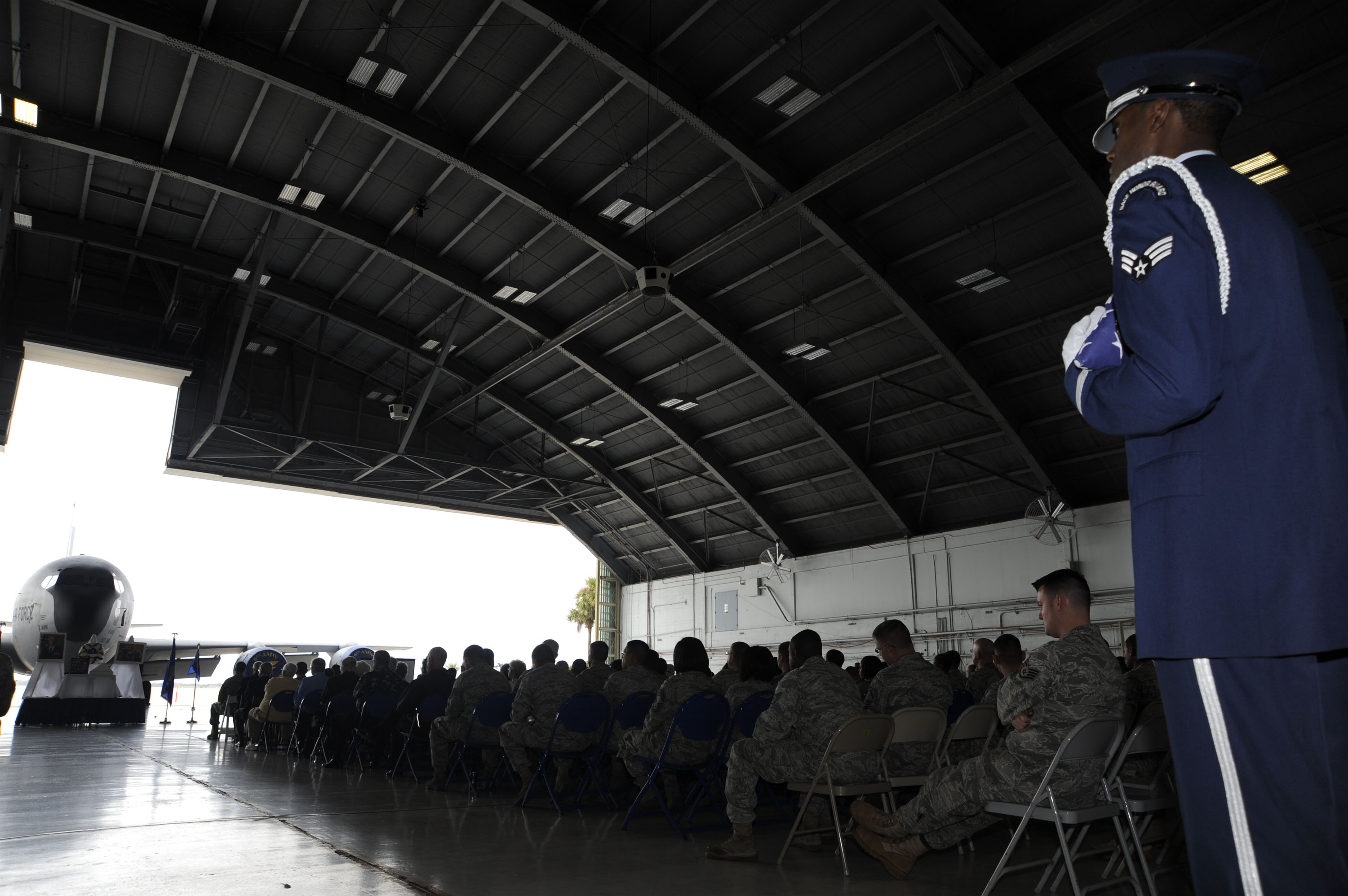 Senior Airman Samuel Blair, 6th Force Support Squadron honor guard, holds The American flag before the memorial service begins Feb. 1, 2011 in honor of Col. David Haar at MacDill Air Force Base, Fla. Colonel Haar, 6th Maintenance Group Commander, passed away Jan. 20, 2011 from natural causes. (U.S. Air Force photo by Staff Sgt. Nancy Hooks/Released)