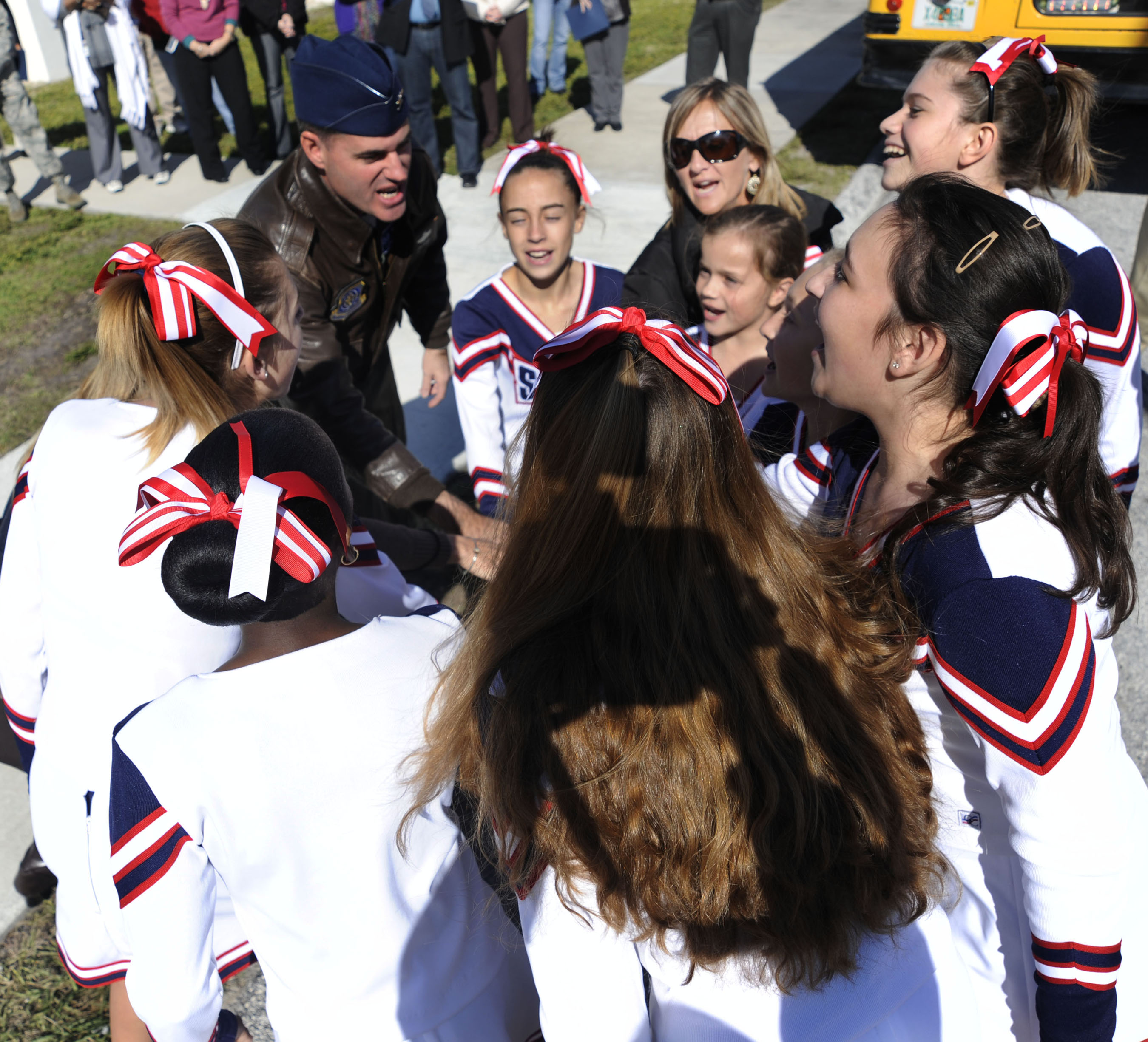 Col. Lenny Richoux, 6th Air Mobility Wing commander, and St. Pete Christian Middle School cheerleaders huddle outside the chapel at MacDill Air Force Base, Dec. 8, 2010, before they unload their bus full of toys for the third annual Stuff the Bus event. The Stuff the Bus campaign is held to provide toys and gift cards to military families here who have been identified by their 1st Sgt. as families that could benefit from assistance during the holiday season. (U.S. Air Force photo by Staff Sgt. Nancy Hooks/Released)