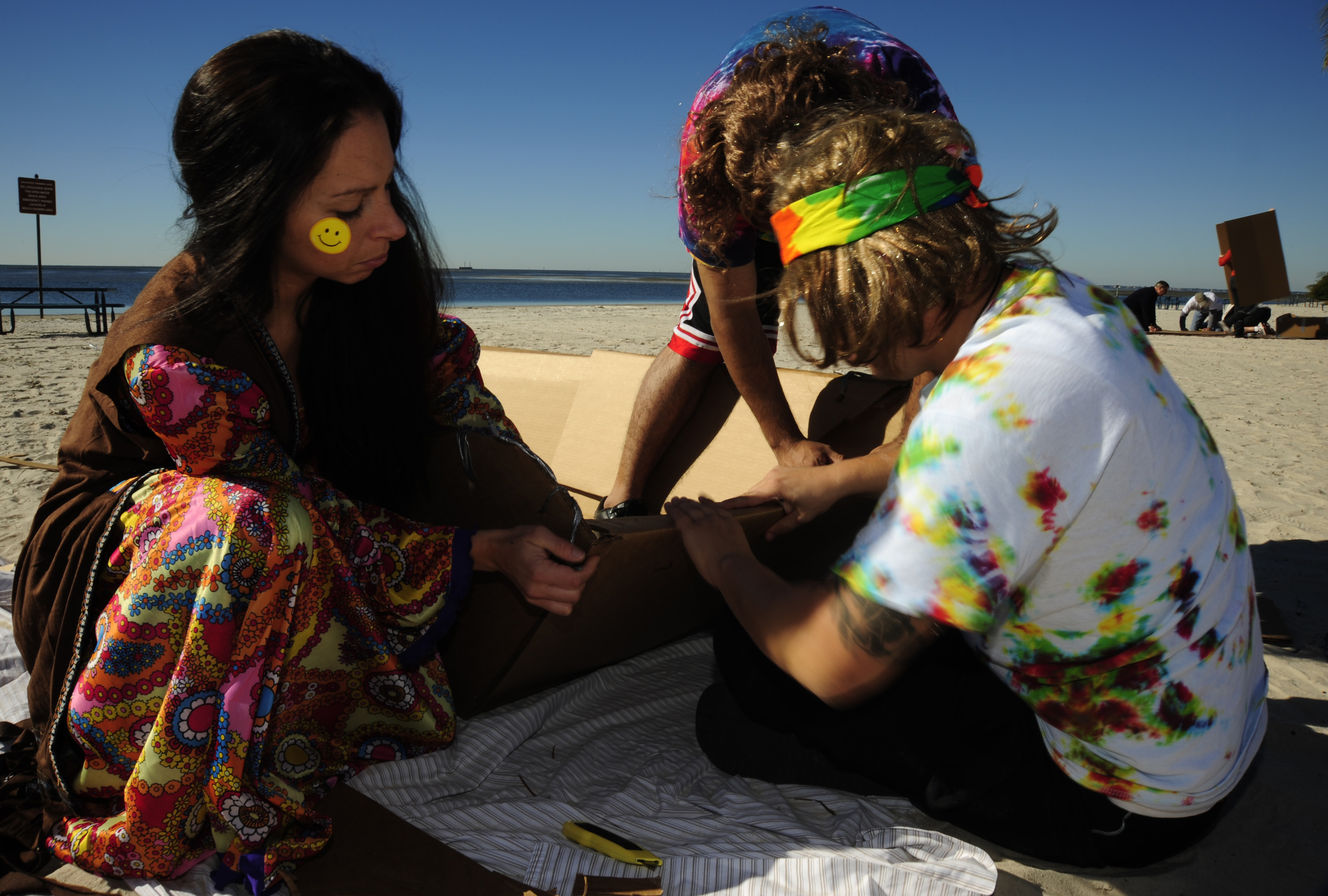 Staff Sgt. Hali Moore, 6th Medial Group, assists her team in building a cardboard boat during the Annual Boat Regatta at MacDill Air Force Base, Fla., Dec 3, 2010. Many participants of the regatta gave their boat a theme; Sergeant Moore's team went with a 1970's theme. (U.S. Air Force photo by: Staff Sgt. Angela Ruiz)