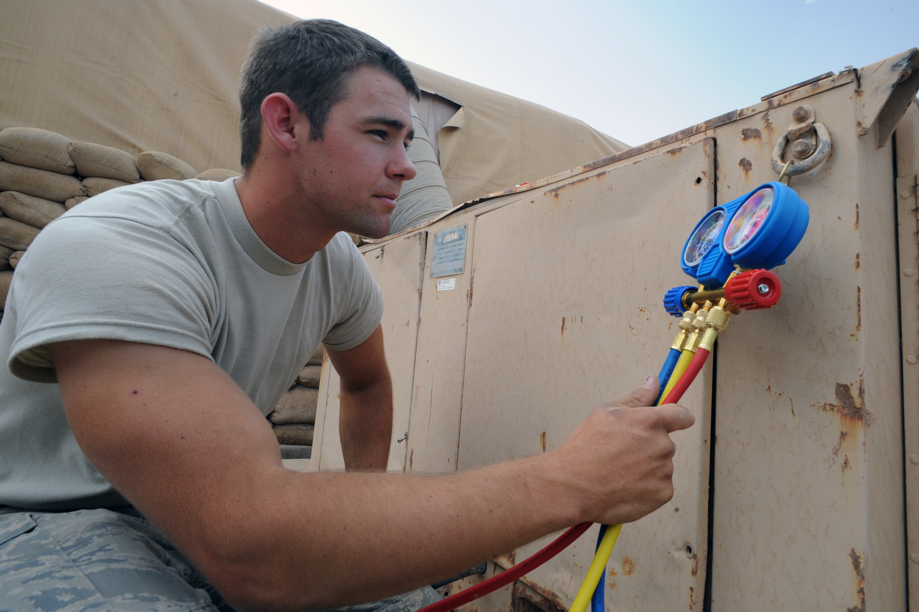 ALI BASE, Iraq -- Airman Tyler Howells, 407th Expeditionary Civil Engineering Squadron air conditioning apprentice, reads manifold gages to check the refrigerant levels of an air conditioning system here May 6. He was selected as the 407th Air Expeditionary Group Warrior of the Week for the week of May 5 and is deployed from Eielson AFB, AK. (U. S. Air Force photo / Tech. Sgt. Sabrina Johnson)
