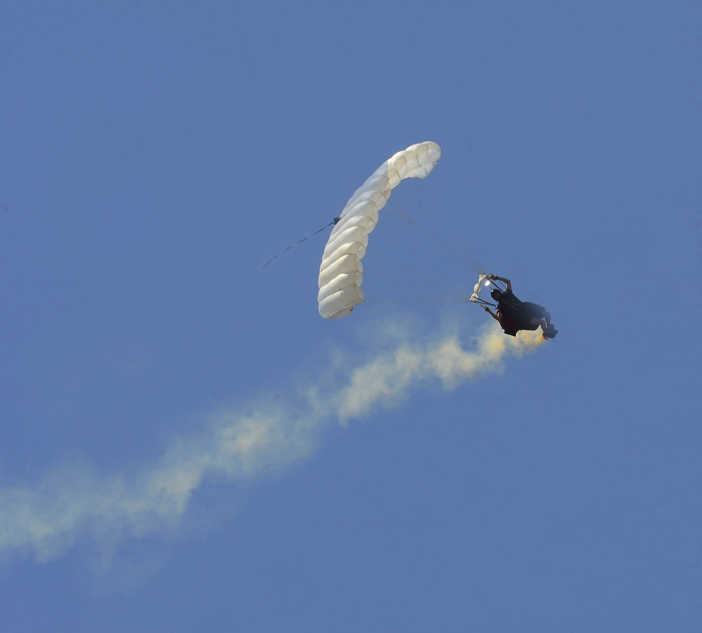 Rex Pemberton straps on a wingsuit, which can glide 3 feet forward for every 1 foot down allowing him to fly across the sky, while Melissa circles him during Tampa Bay AirFest 2014 March 22, 2014 at MacDill Air Force Base, Fla. Melissa flys in her high performance Edge 540 Aircraft as he descends from 10,000 feet above the ground until he opens his parachute at 2,000 feet. (U.S.Air Force photo by Senior Airman Jenay Randolph/Released)