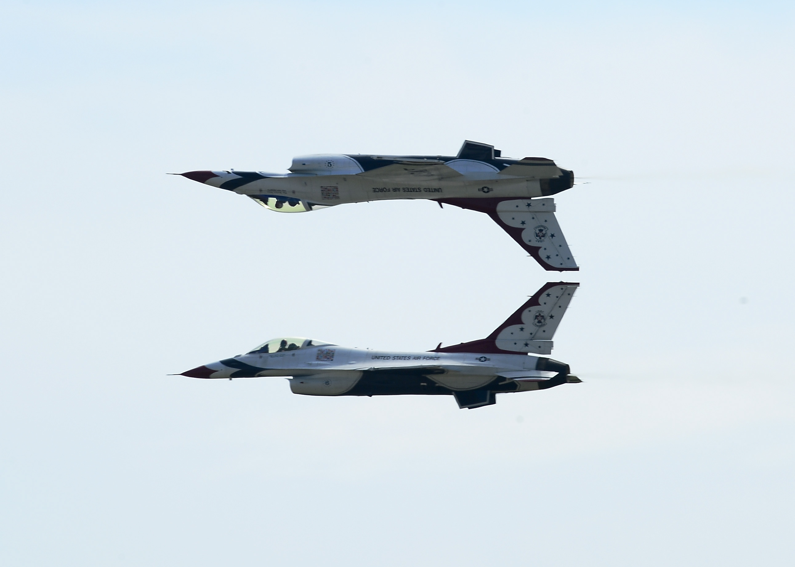 The U.S. Air Force Air Demonstration Squadron Thunderbirds form mirror images during an aerial demonstration for Tampa Bay AirFest 2014 at MacDill Air Force Base, Fla., March 22, 2014. AirFest offers the public an opportunity to meet the men and women of the armed forces and see military equipment through the efforts of active duty, guard and reserve service members, as well as civilian employees, retirees and family members. (U.S. Air Force photo by Senior Airman Shandresha Mitchell/Released)