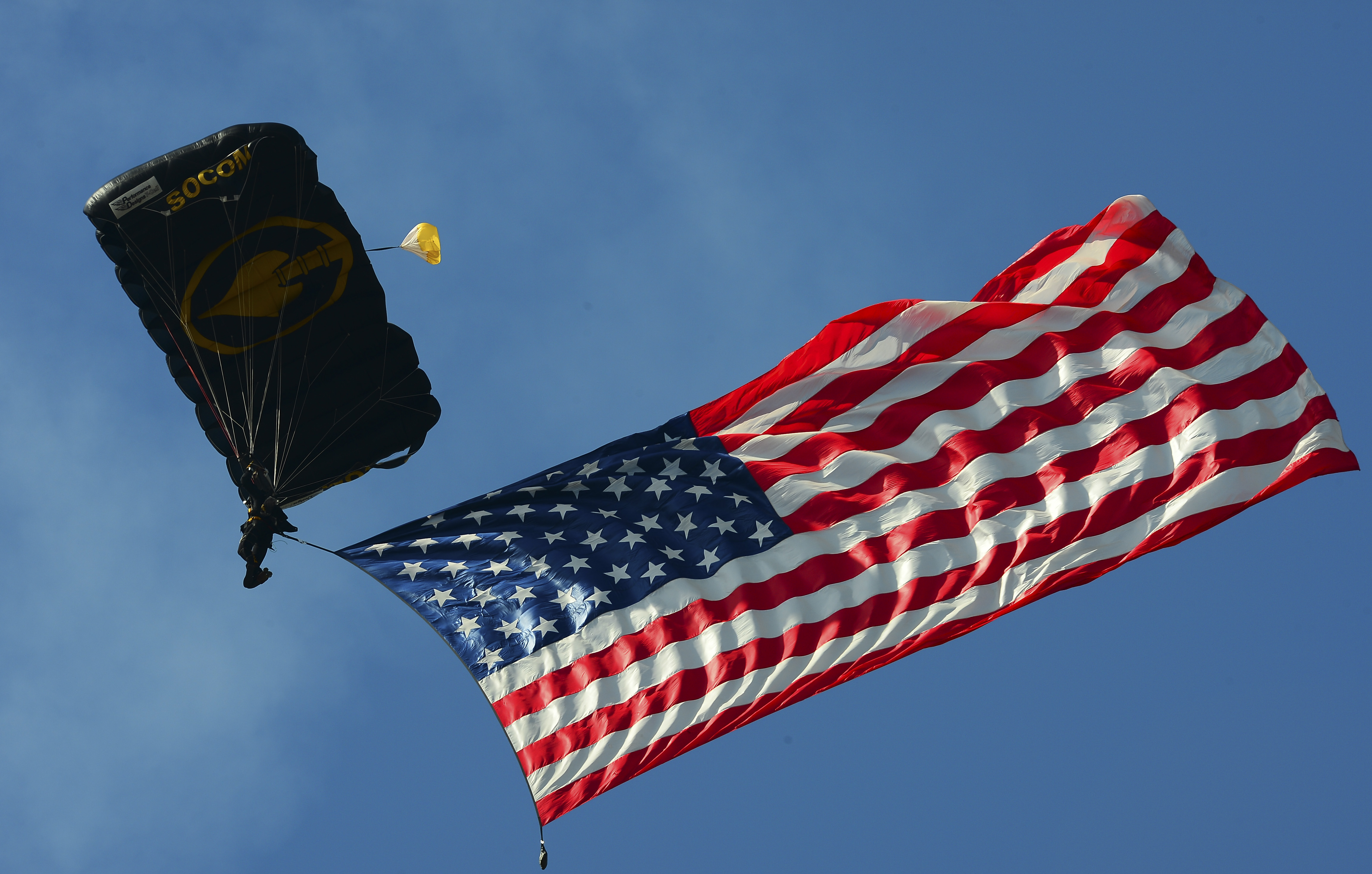 Army Lt. Col. Ken Ates, United States Special Operations Command paracommando, displays the flag during the National Anthem at the Tampa Bay AirFest 2014 at MacDill Air Force Base, Fla., March 22, 2014. AirFest offers the public an opportunity to meet the men and women of the armed forces and see military equipment through the efforts of active duty, guard and reserve service members, as well as civilian employees, retirees and family members. (U.S. Air Force photo by Senior Airman Shandresha Mitchell/Released)