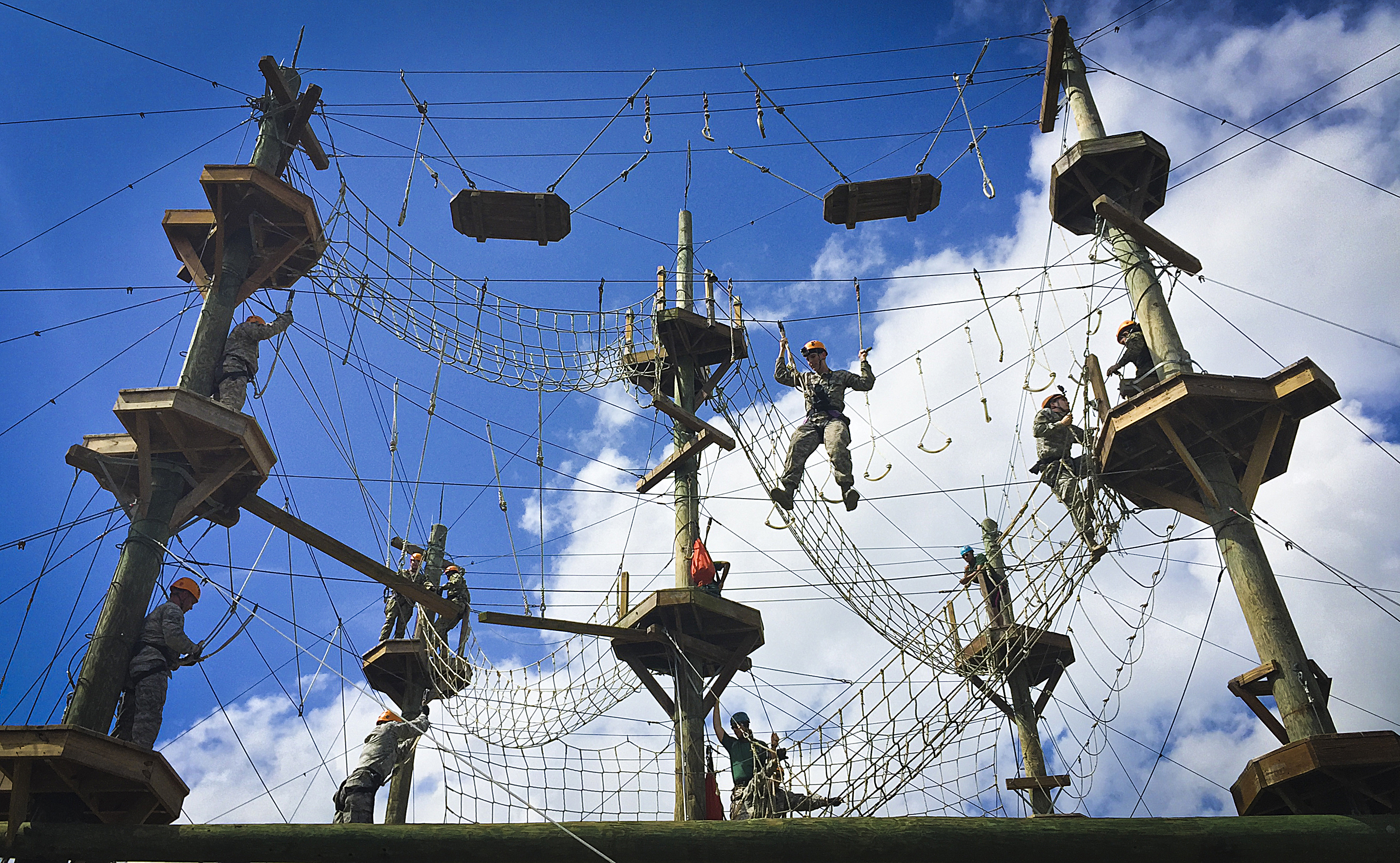 Members of the Joint Communications Support Element, complete a ropes course during a physical and mental assessment of Warrior Spirit ’15, Tampa, Fla., March 5, 2015. Members of the JCSE were tested on their physical, mental, technical and teamwork capabilities during the week-long Warrior Spirit ’15 exercise. (U.S. Air Force photo by Tech. Sgt. Brandon Shapiro/Released)