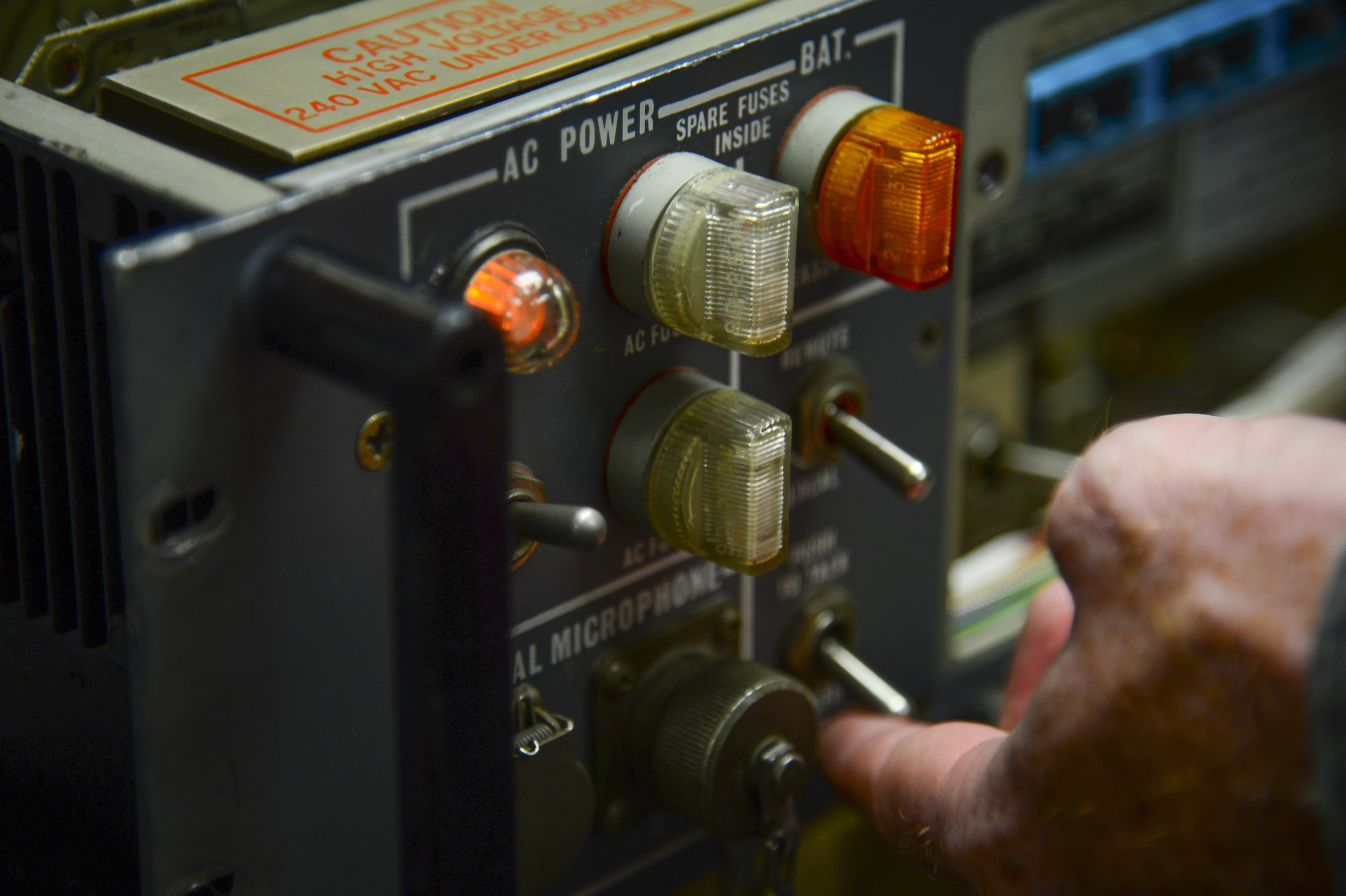 Senior Airman Thomas Morris, 6th Operations Support Squadron airfield systems technician, performs a carrier test on a very high frequency transmitter at MacDill Air Force Base, Fla., July 9, 2015. Morris and other airfield systems Airmen perform preventative maintenance inspections on the radio equipment to catch problems before they occur. (U.S. Air Force photo by Senior Airman Ned T. Johnston/Released)