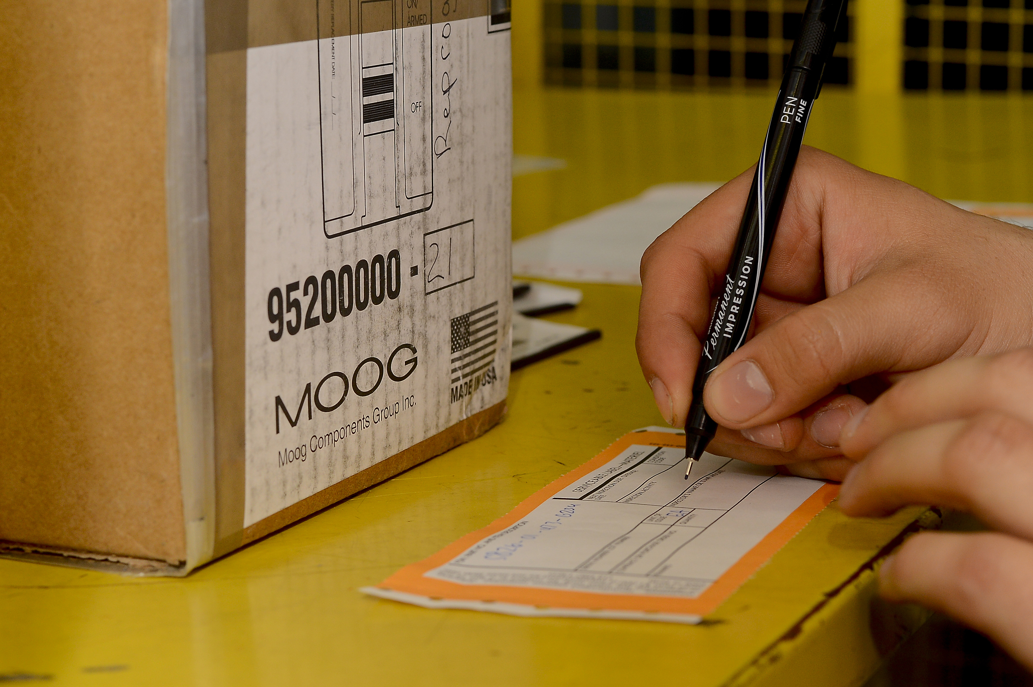 Senior Airman Alexandro Zamago, a central storage technician with the 6th Logistics Readiness Squadron, fills out an identification tag in a storage facility at MacDill Air Force Base, Fla., Feb. 25, 2016. The tag is then put on the box and is used to identify the part. (U.S. Air Force photo by Airman 1st Class Mariette Adams)