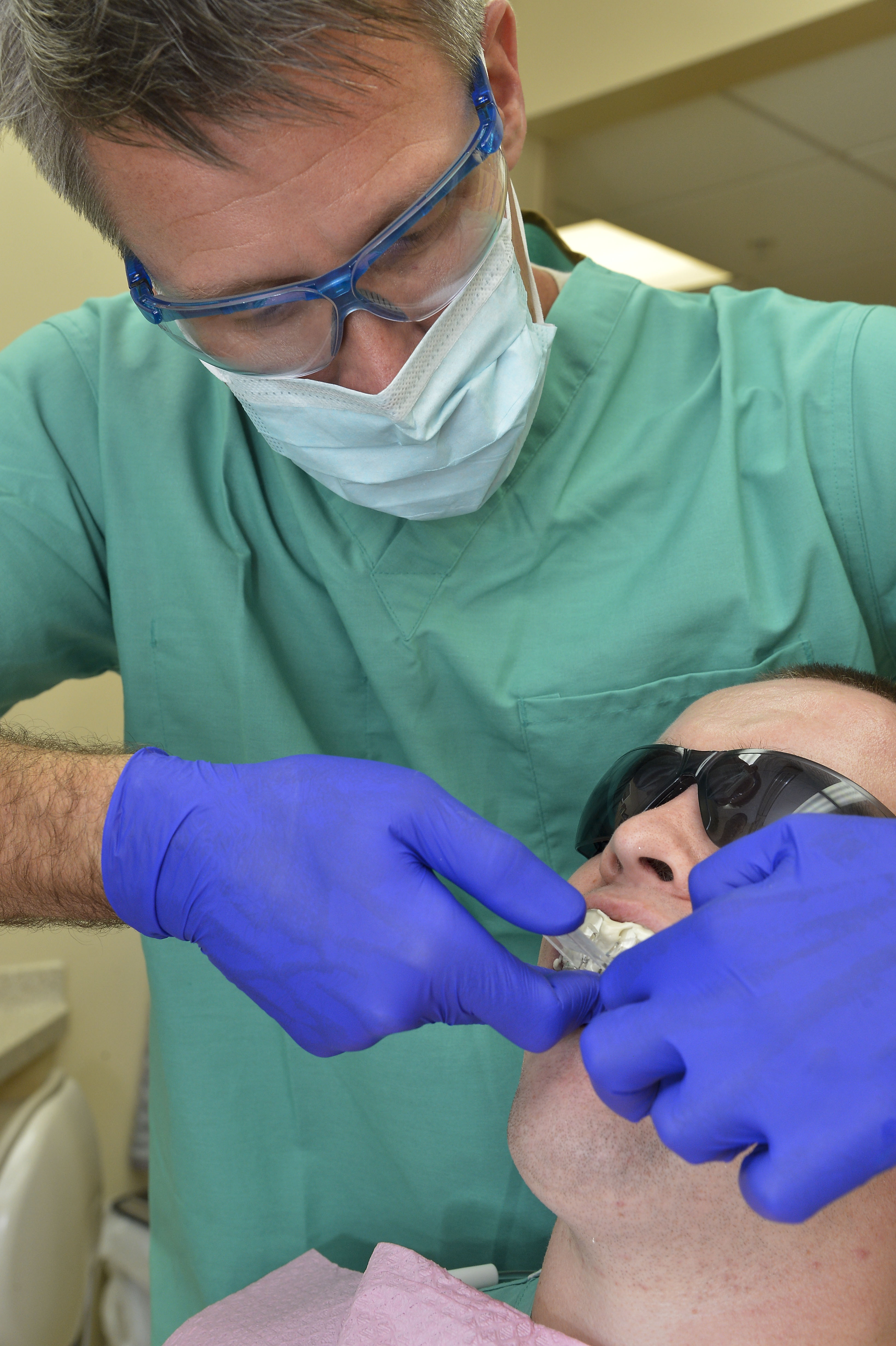 Col. Daniel Tulley, 6th Air Mobility Wing commander, practices making a dental impression on Airman 1st Class David Coleman, 6th Dental Squadron dental technician, during Airmen’s Time at MacDill Air Force Base, Fla., Sept. 3, 2015. Dental impressions are used to create casts for treatment planning, fabrication of custom trays, fabrication of dentures, crowns or other prostheses and orthodontics. (U.S. Air Force photo by Staff Sgt. Shandresha Mitchell/Released)