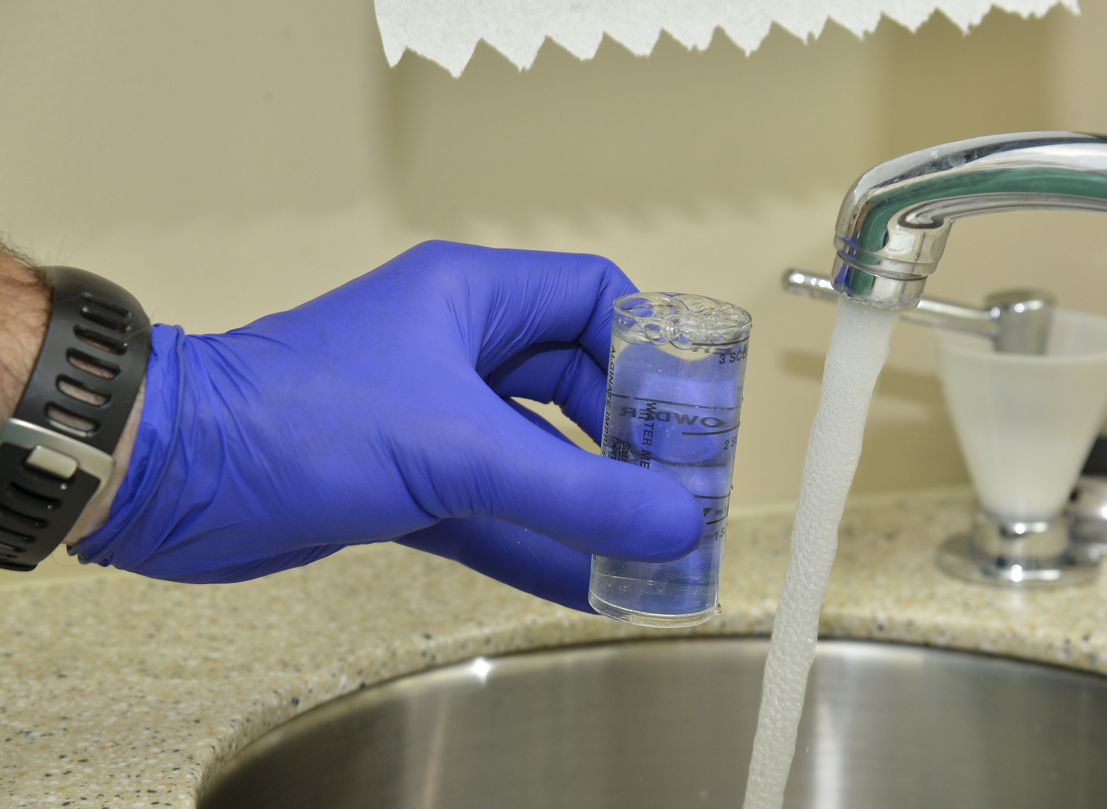 Col. Daniel Tulley, 6th Air Mobility Wing commander, fills a container with water before mixing it with the necessary materials needed to make dental impressions during Airmen’s Time at MacDill Air Force Base, Fla., Sept. 3, 2015. Airmen’s Time is a weekly event in which Tulley meets with Airmen throughout the wing to receive first-hand experience in the Airmen’s daily tasks. (U.S. Air Force photo by Staff Sgt. Shandresha Mitchell/Released)