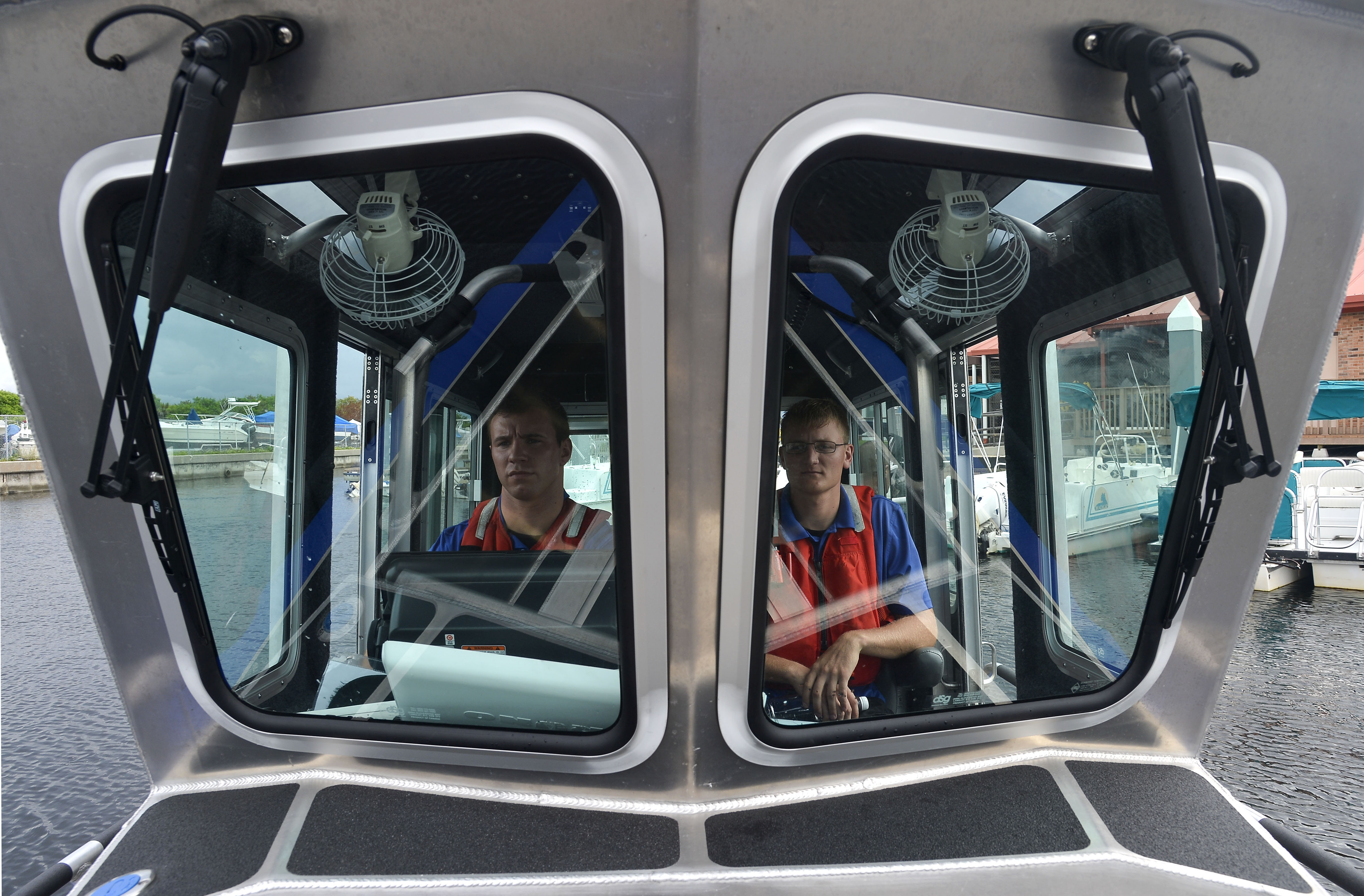 Senior Airmen Michael Hafke and Jay Moccia, 6th Security Forces Squadron marine patrolmen, park the boat in the marina at MacDill Air Force Base, Fla., Sept. 17, 2015. The Airmen had just returned from simulating a man over board scenario during a Boat Operations and Training Program near Bayboro Harbor in St. Petersburg, Fla. (U.S. Air Force photo by Staff Sgt. Shandresha Mitchell/Released)