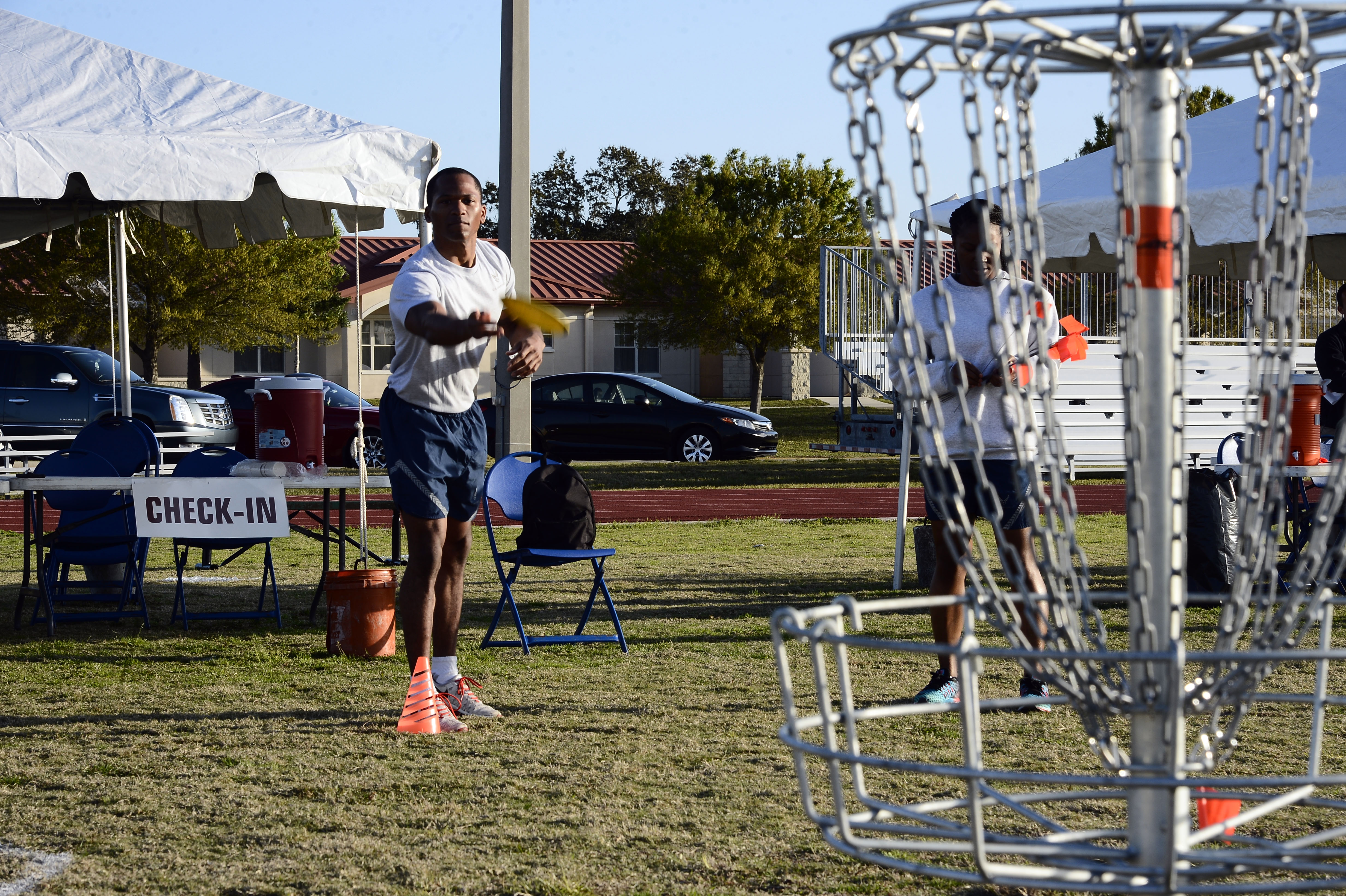 Staff Sgt. Martell Roberts, customer support technician with the 6th Logistics Readiness Squadron, throws a flying disc at the discus station during the MacOlympics at MacDill Air Force Base, Fla., Feb. 26, 2016. Each contestant was given 10 attempts to throw the flying disc into the basket or get as close to the basket as possible. The MacOlymics was a wing wide event to build morale and unit cohesion. (U.S. Air Force photo by Senior Airman Tori Schultz)