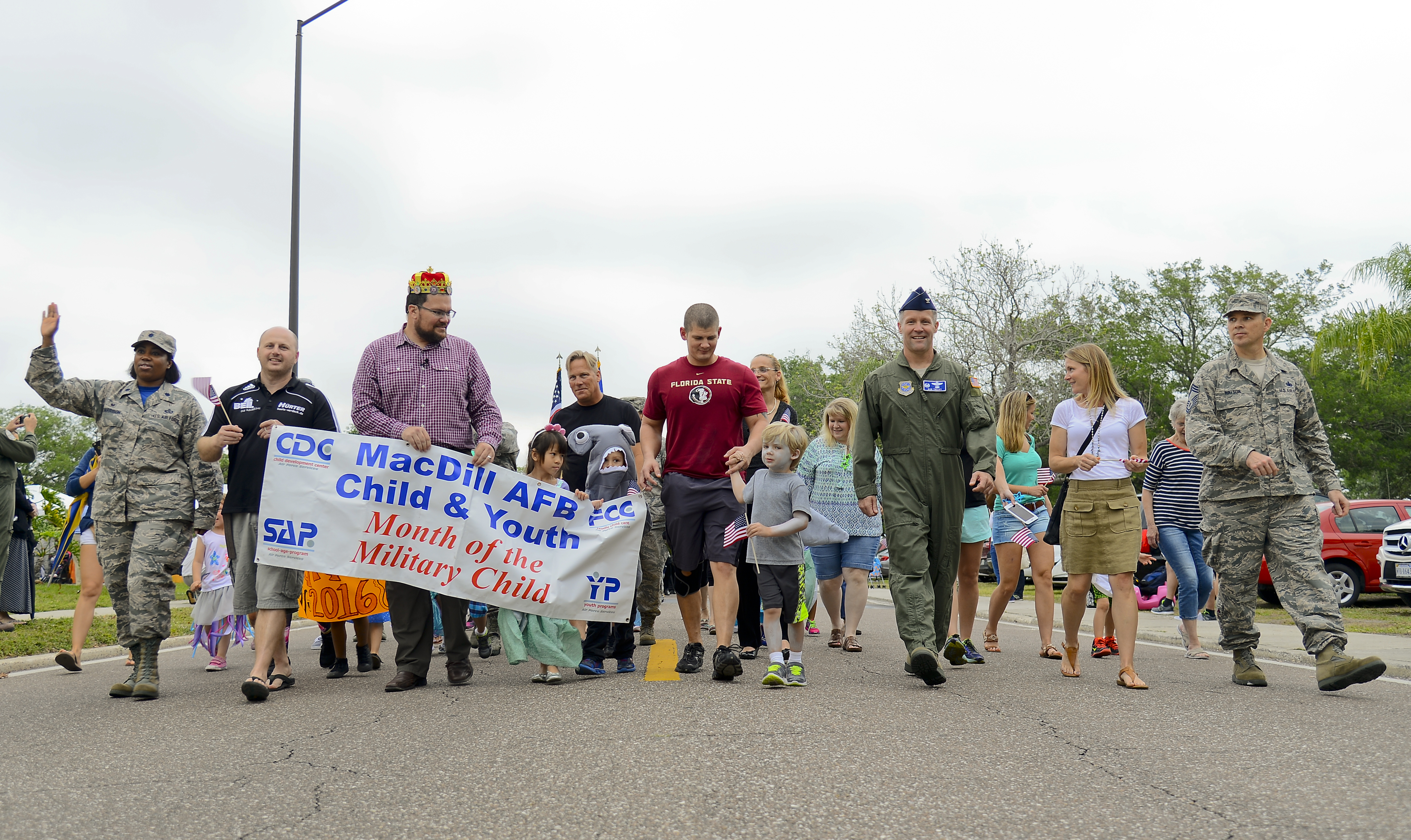 Children, parents and staff from the Child Development Centers and members of Team MacDill walk in the Month of the Military Child parade April 15, 2016, at MacDill Air Force Base, Fla. Throughout the month of April, the centers will be hosting a calendar of events, to include an ice cream social, flight art auction, sidewalk chalk art walk, along with various spirit and themed days. (U.S. Air Force photo by Senior Airman Ned T. Johnston)